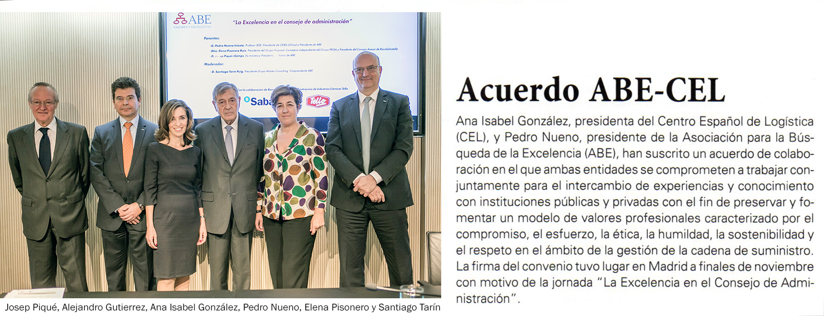 La firma del convenio tuvo lugar durante la celebración de la Jornada La Excelencia en el Consejo de Administración, que se celebró en las instalaciones del Banco Sabadell en la calle Serrano de Madrid, en el que intervinieron Pedro Nueno Iniesta, Elena Pisonero Ruiz y Josep Piqué i Camps, ante directivos y profesionales convocados por la Asociación para la Búsqueda de la Excelencia (ABE). El acto contó con el patrocinio de Industrias Cárnicas Tello.