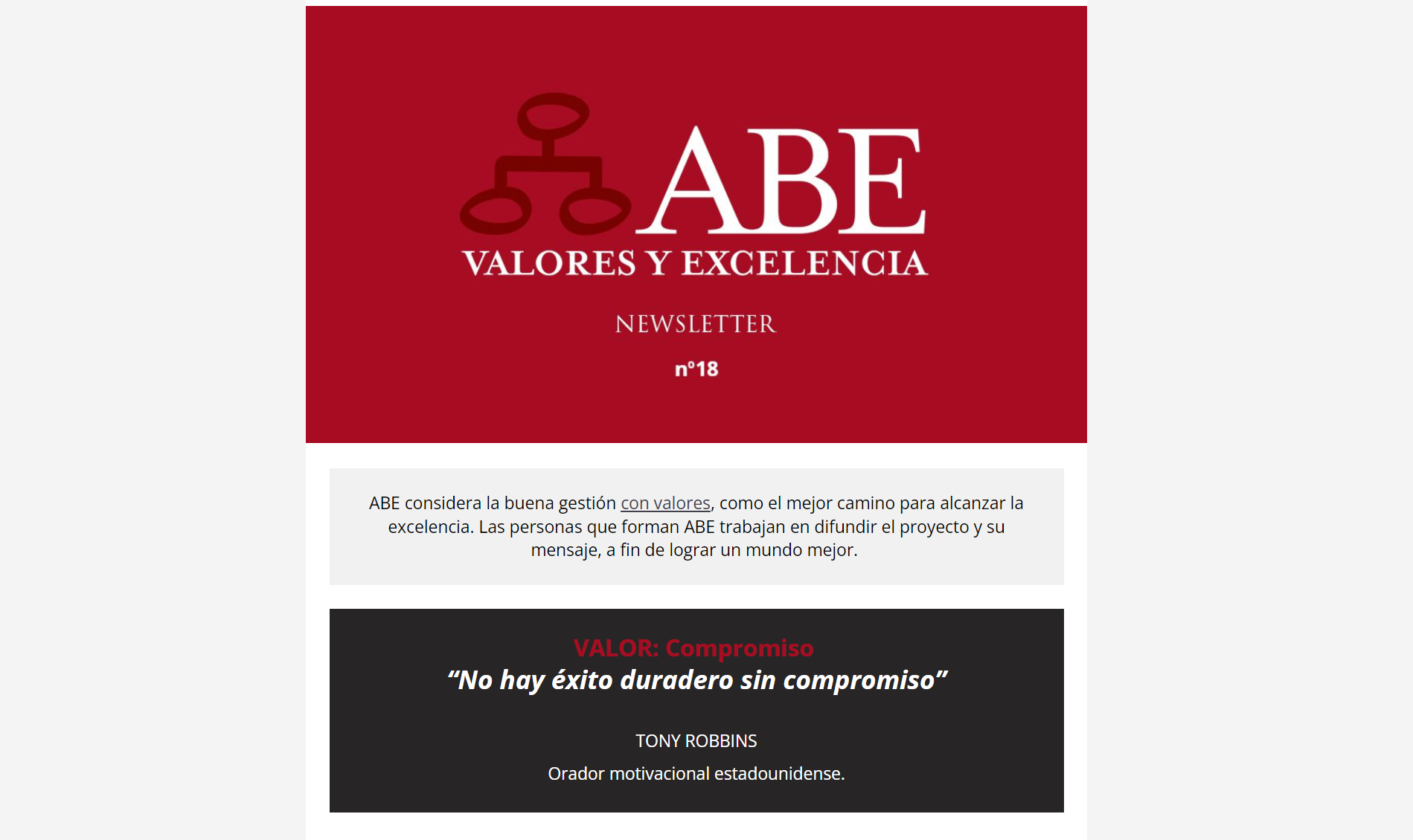 VALOR: Compromiso “No hay éxito duradero sin compromiso”. TONY ROBBINS Orador motivacional estadounidense. Ver toda la newsletter Compartir este artículo:LinkedInTwitter autor Comunicación ABE Documentación relacionadaPedro Nueno: Humildando07/10/2025Josep Lluís Rovira: La inmadurez colectiva07/10/2025Newsletter 20 – junio 202509/07/2025Michael Sandel: “Si los mercados definen lo que es valioso se crea un vacío moral que llena la religión y el nacionalismo”26/06/2025Xavier Marcet: Un referente generoso y de risa franca26/06/2025¿Negociar “por obligación legal”?26/06/2025